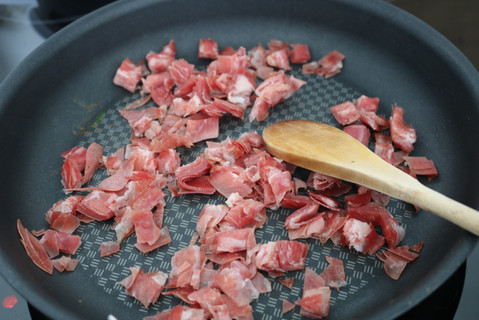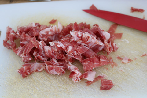 Toujours dans la même poêle, faire revenir quelques minutes la coppa coupé en morceaux. Mettre de côté comme les autres ingrédients cuits précédemment.